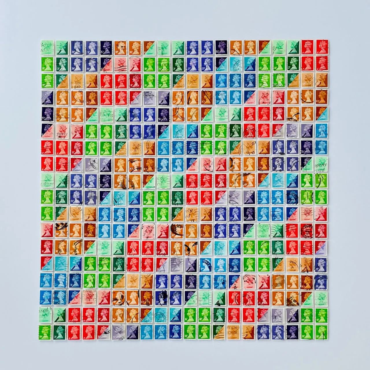 Artwork created with used unique postage stamps