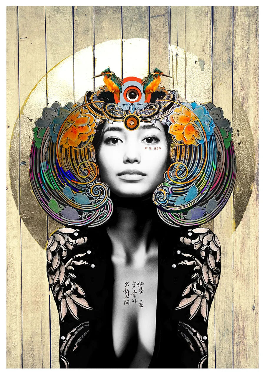 Hand finished with Gold Leaf and and Silver Leaf ‘points’ plus metallic acrylics and vintage Japanese Hanko stamps. Giclée printed onto 315 gram Soft Textured Cotton fine art paper