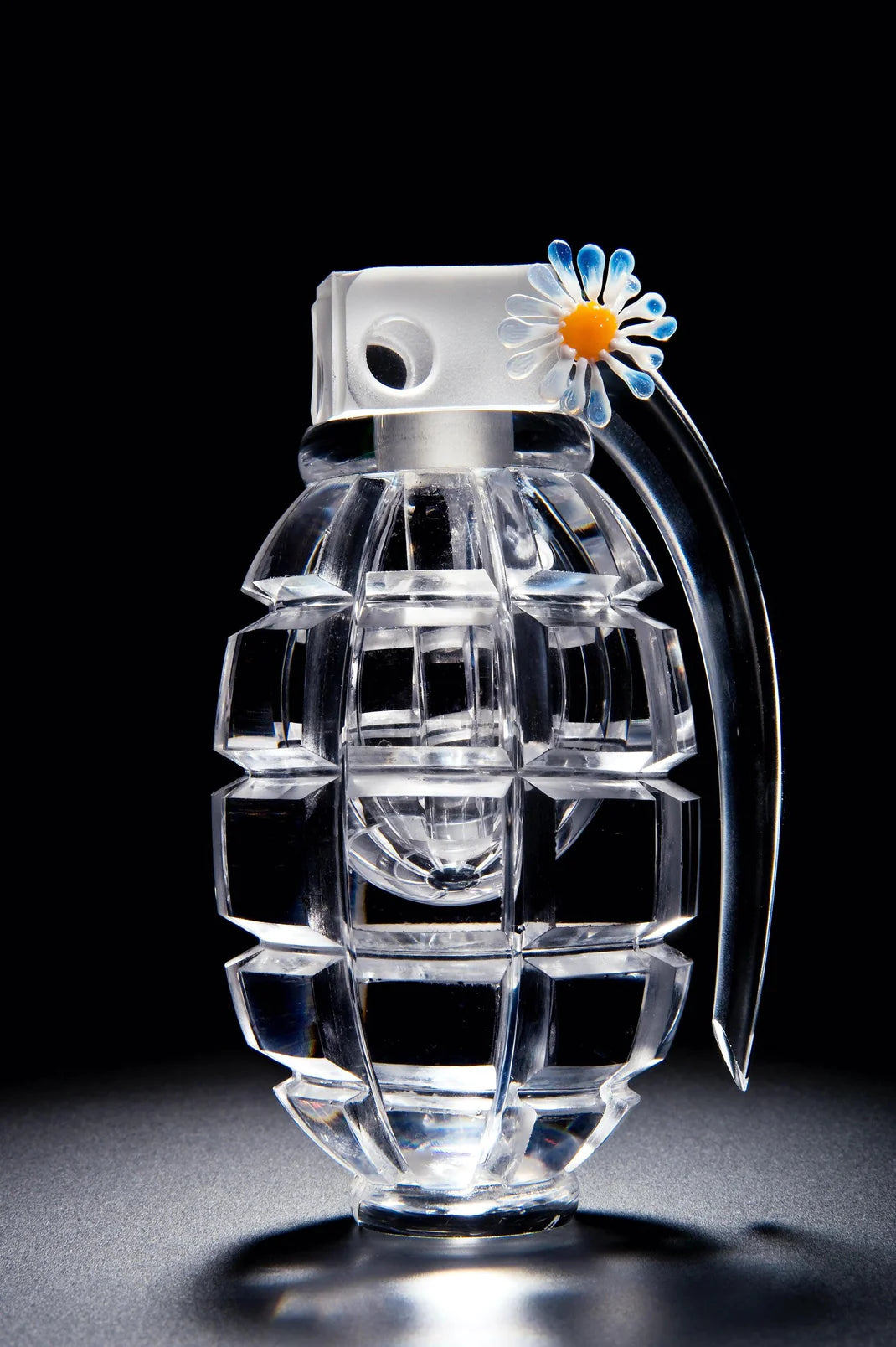 Hot sculpted glass, cut polished and assembled with lampworked daisies