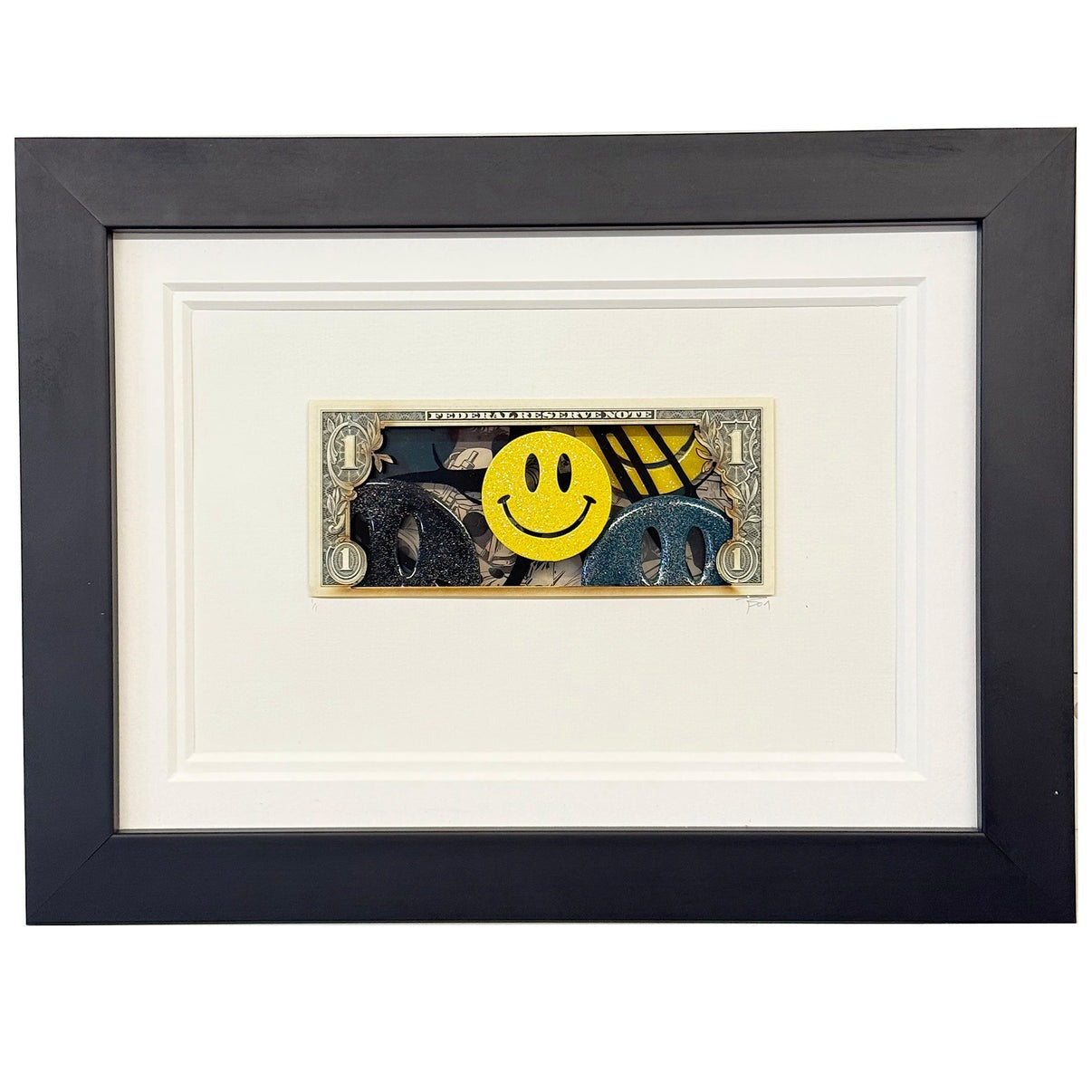 Detailed abstract piece built in layers under original dollar note and layers of acrylic
