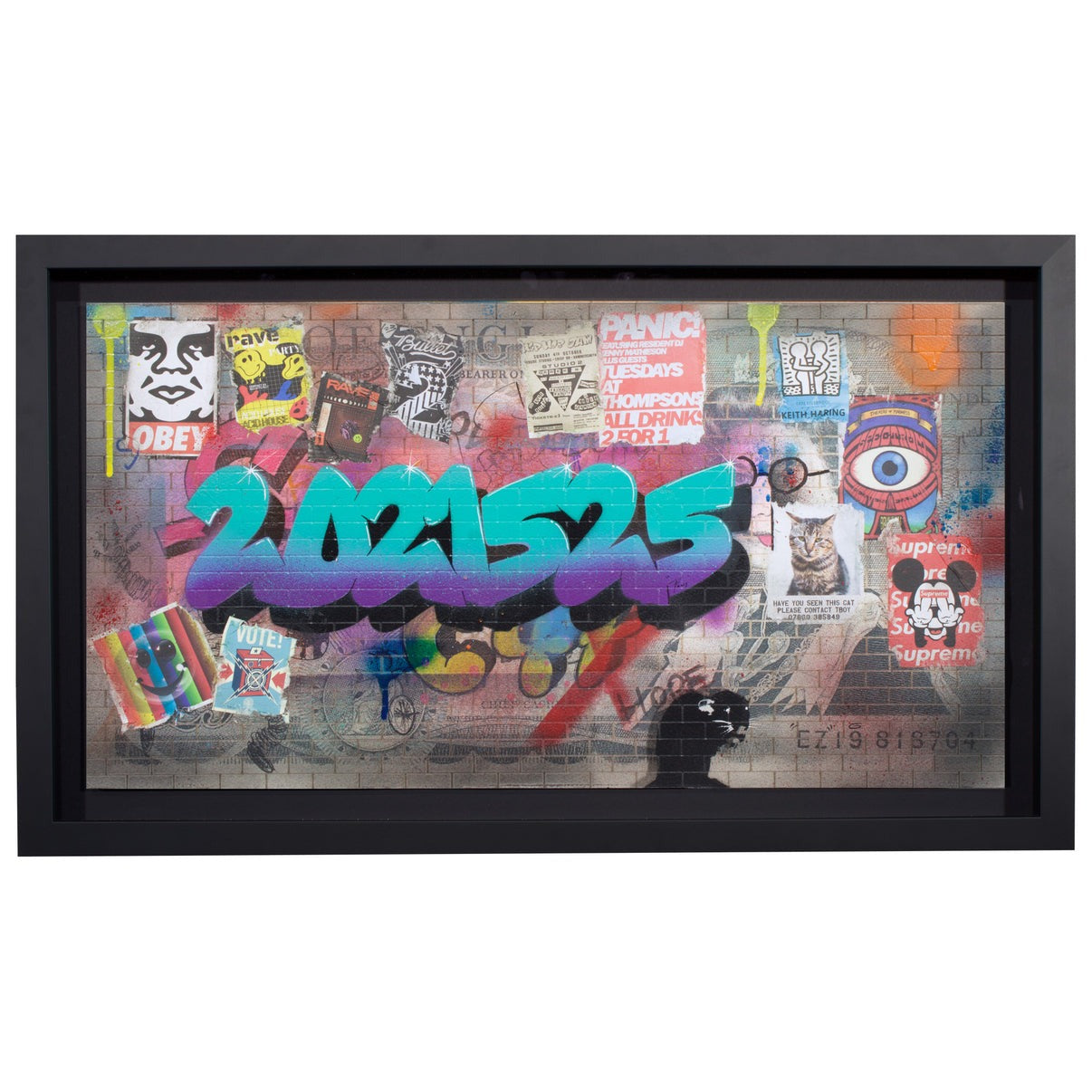 Made with laser cut currency wall, spray can, collage, stencil work and fly posters. Float mounted in a box frame with art glass